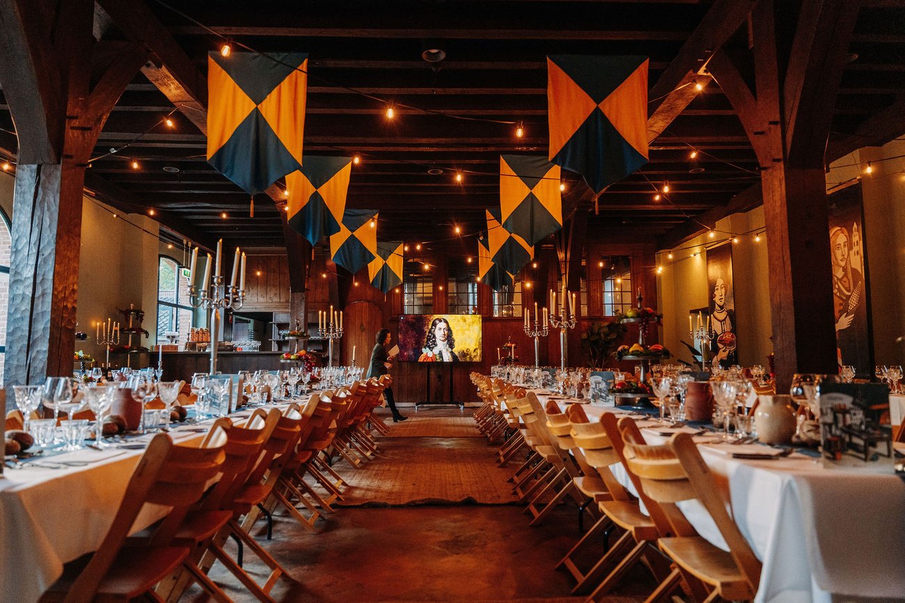 We dineren binnen aan gezellige lange tafels. Voorafgaand aan het diner maken we een wandeling door het kasteel. Sommige delen van de wandeling zijn niet overdekt. De herfst is inmiddels aangebroken, dus we raden altijd aan om het weerbericht in de gaten te houden. Het kan in de avond wat afkoelen. Zorg daarom voor wat extra laagjes. Is het weer wisselvallig? Neem voor de zekerheid een paraplu mee zodat je onbezorgd van de wandeling kan genieten. We doen daarnaast ons uiterste best om een aangename temperatuur te creƫren in het Koetshuis. Toch kan een extra laagje geen kwaad. Mocht je twijfelen over een extra jas of sjaaltje, dan is ons advies om deze mee te nemen.